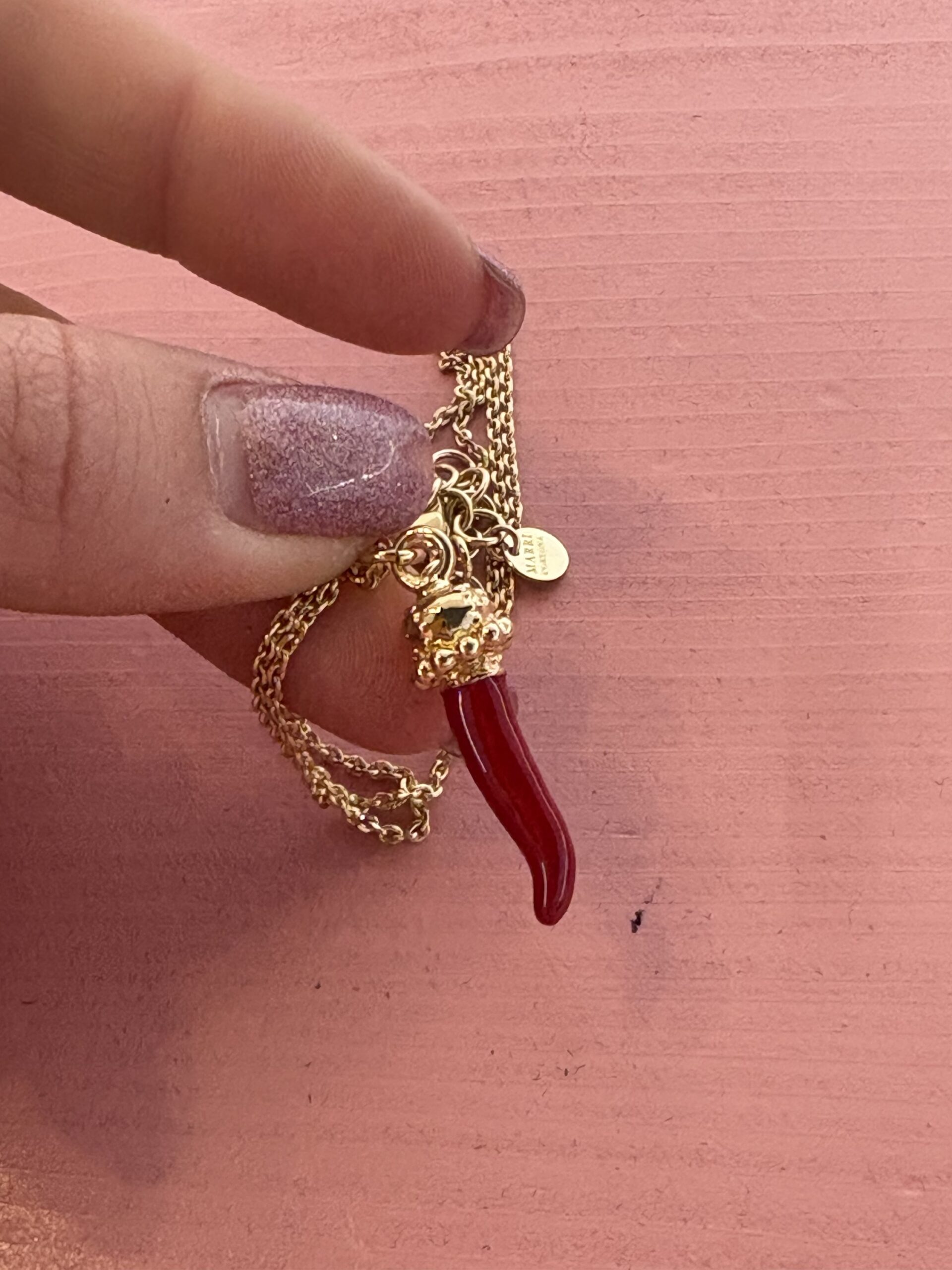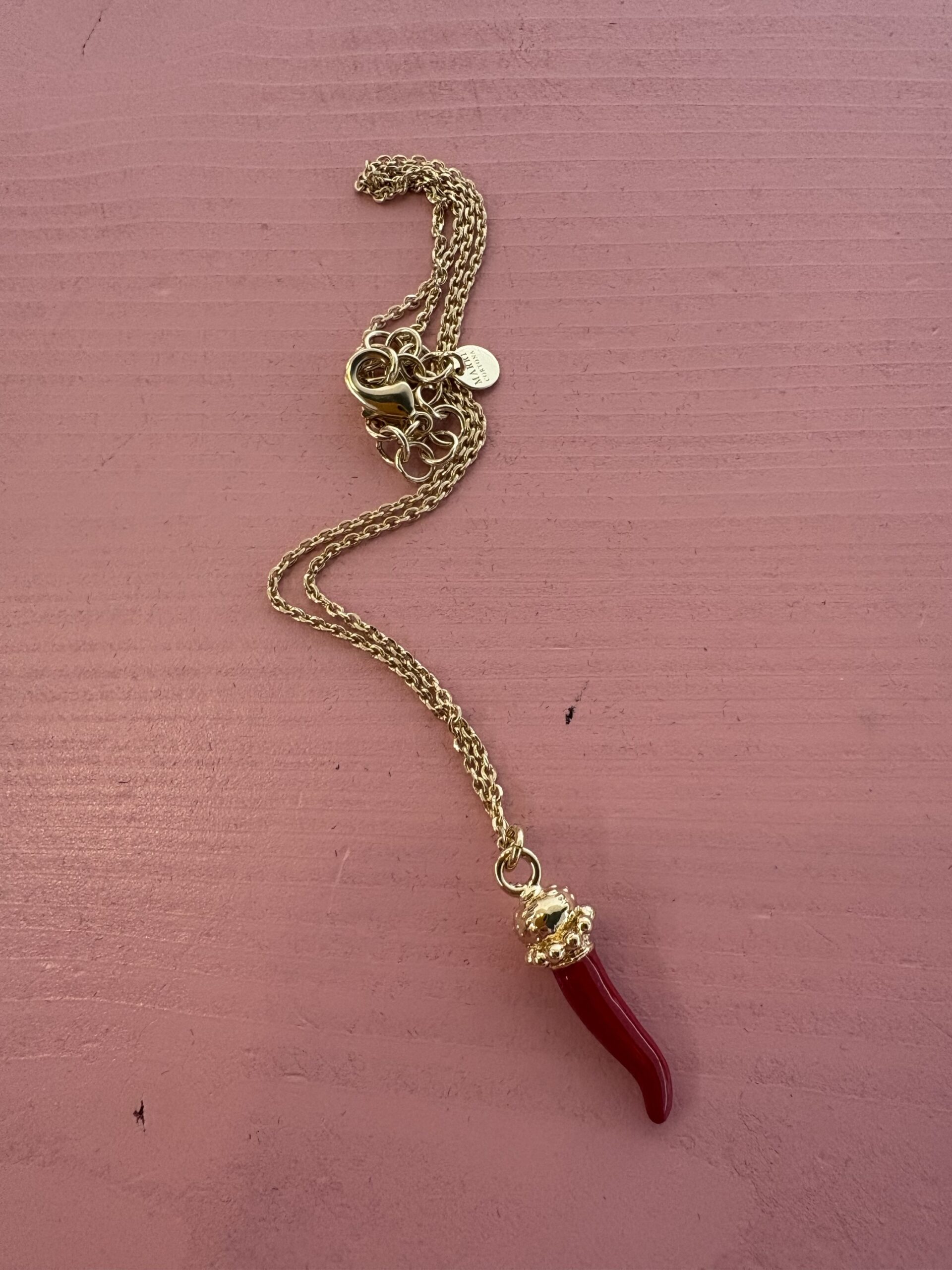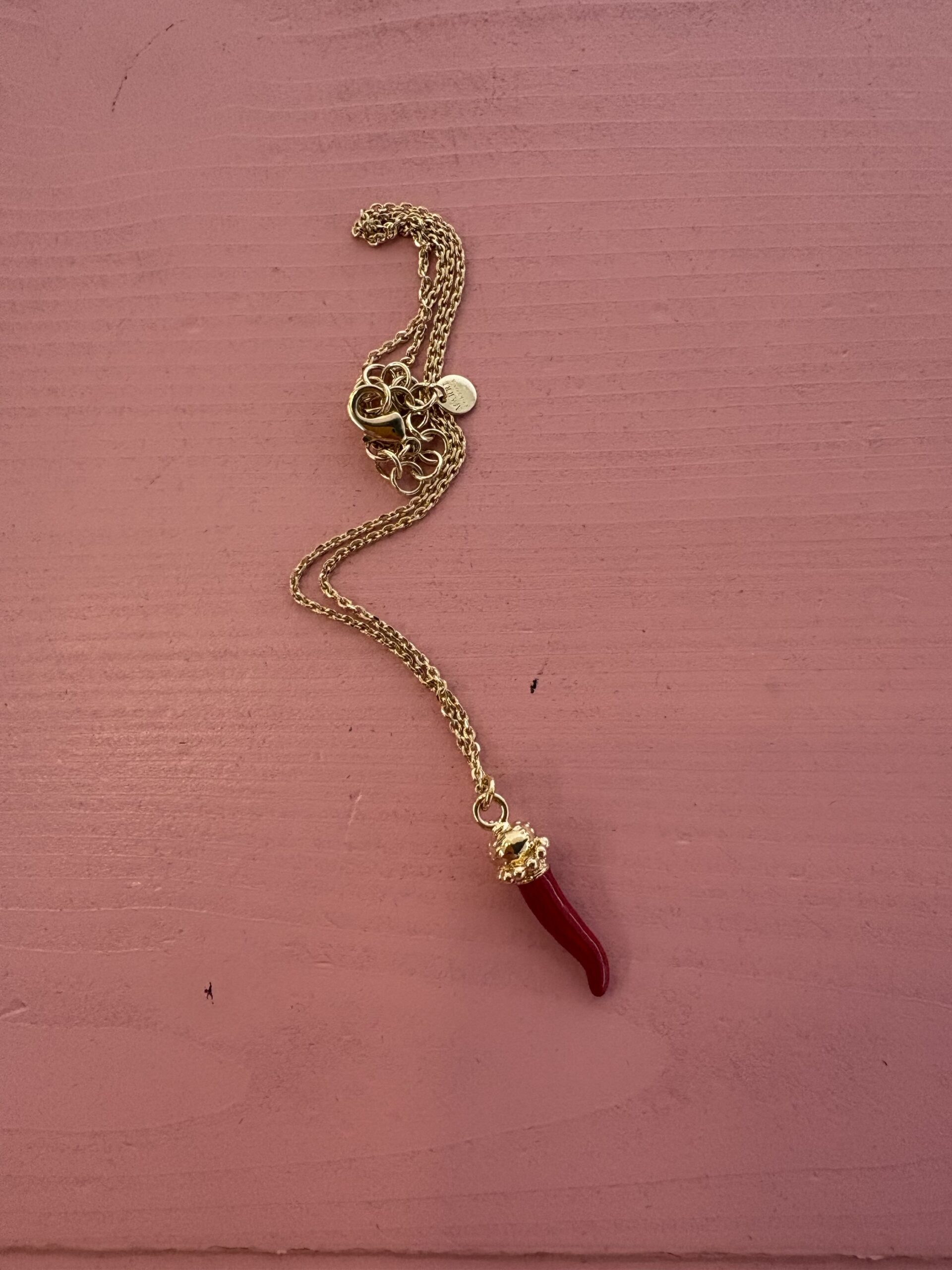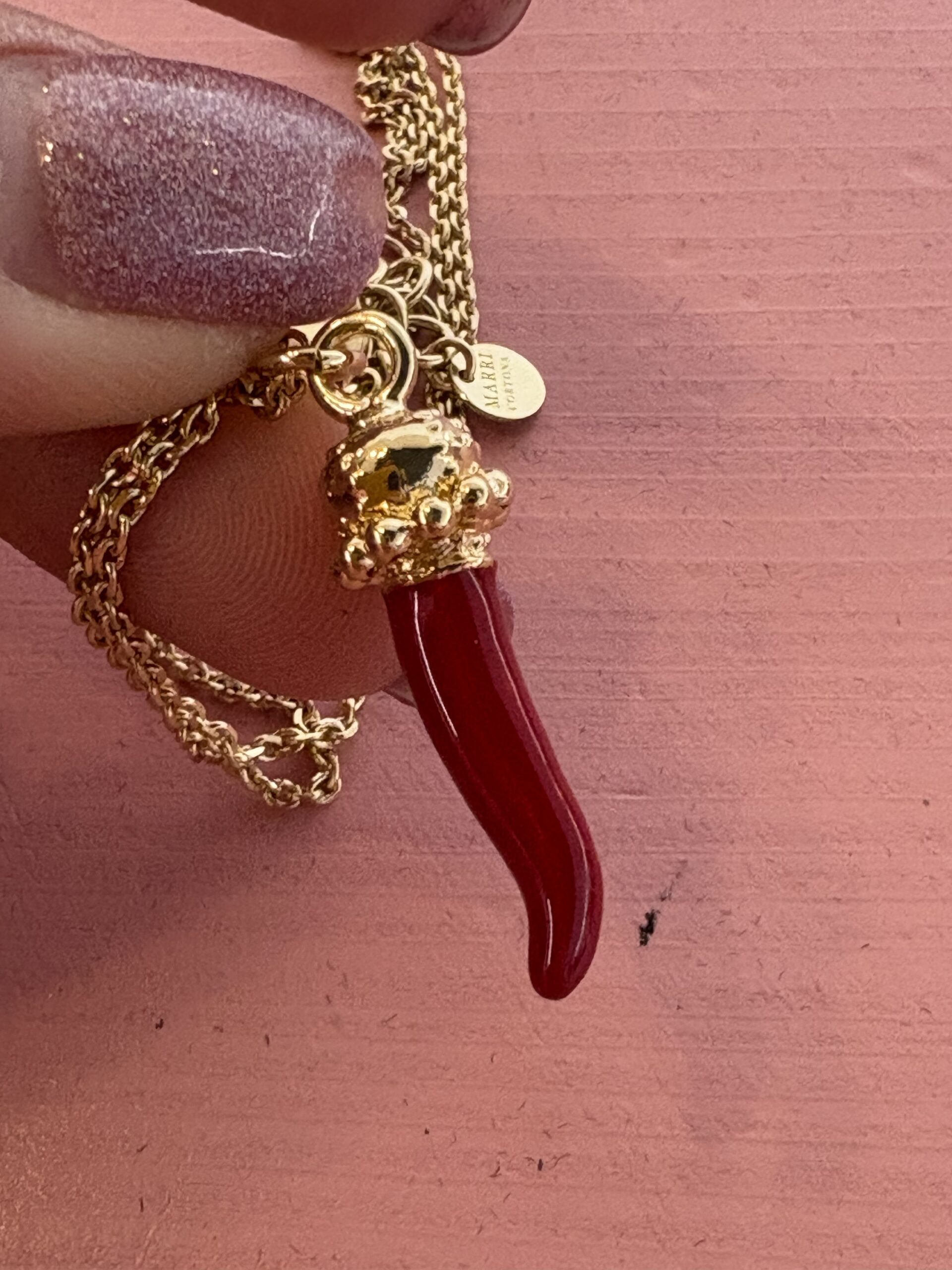 Un corno portafortuna è un simbolo molto popolare per protezione e fortuna. Il tuo amuleto suona molto elegante, con il bronzo placcato in oro 18 carati e lo smalto rosso. Sicuramente attirerà l’attenzione e potrebbe portare fortuna ovunque tu vada.