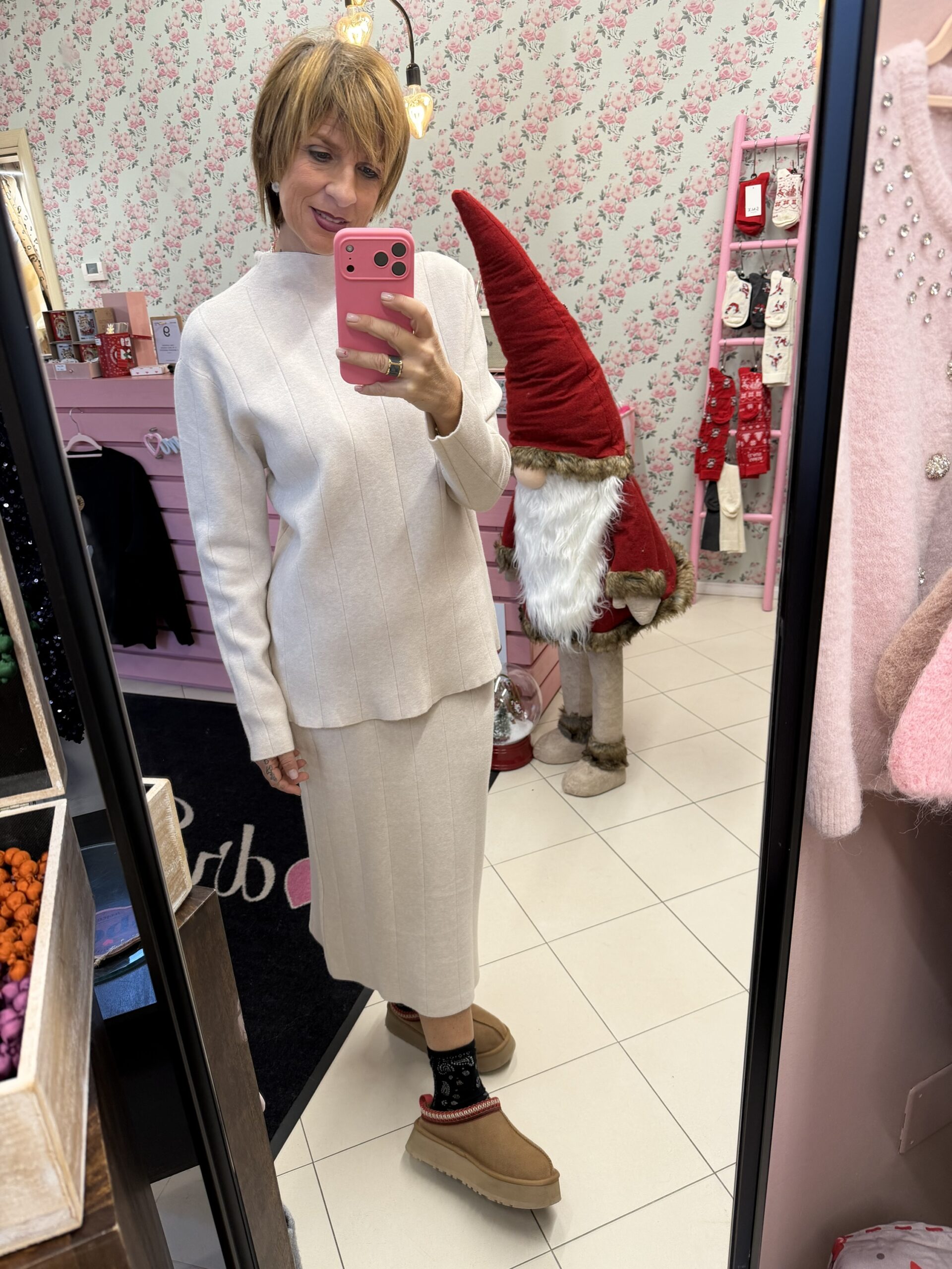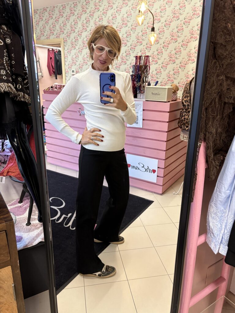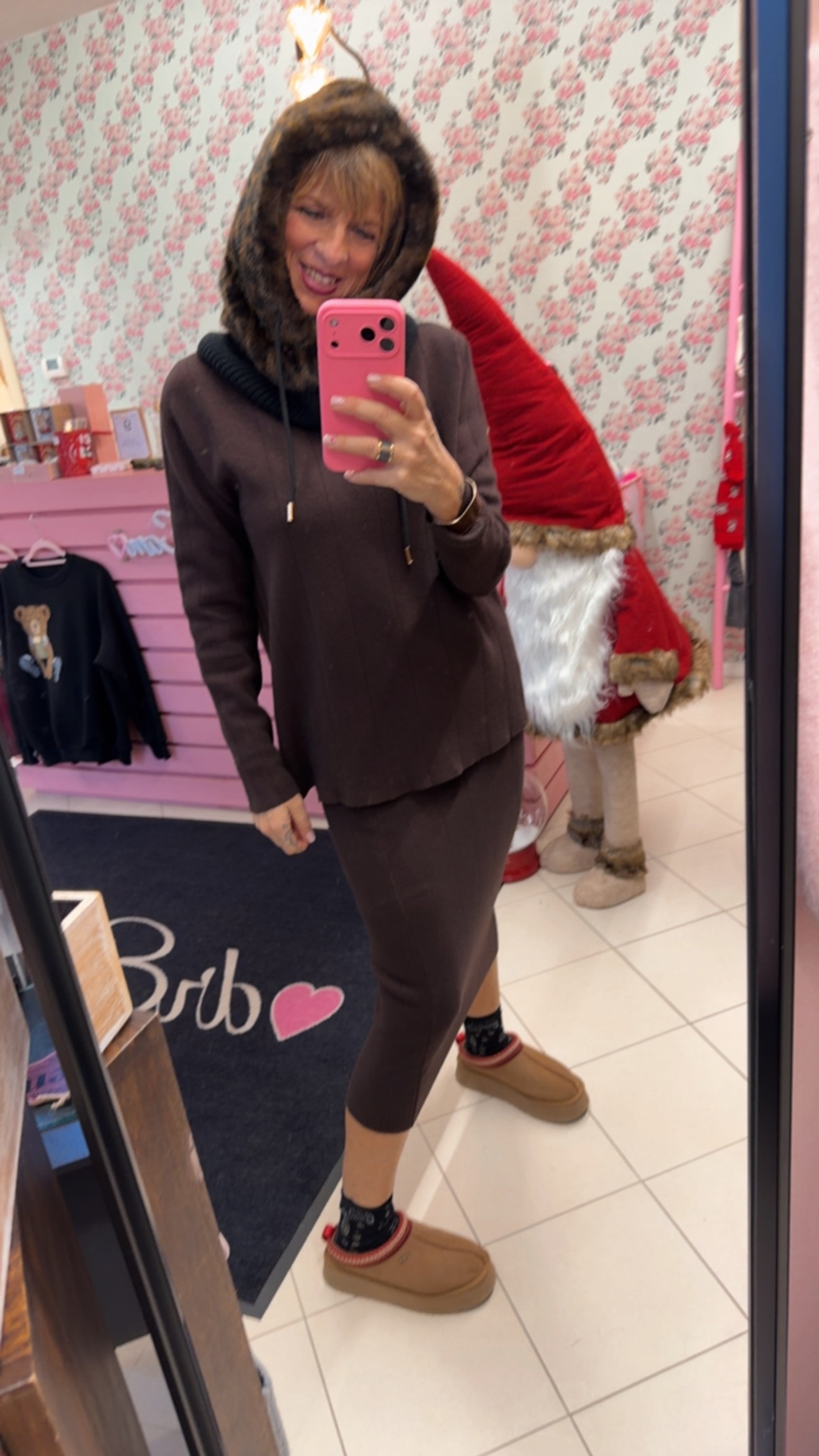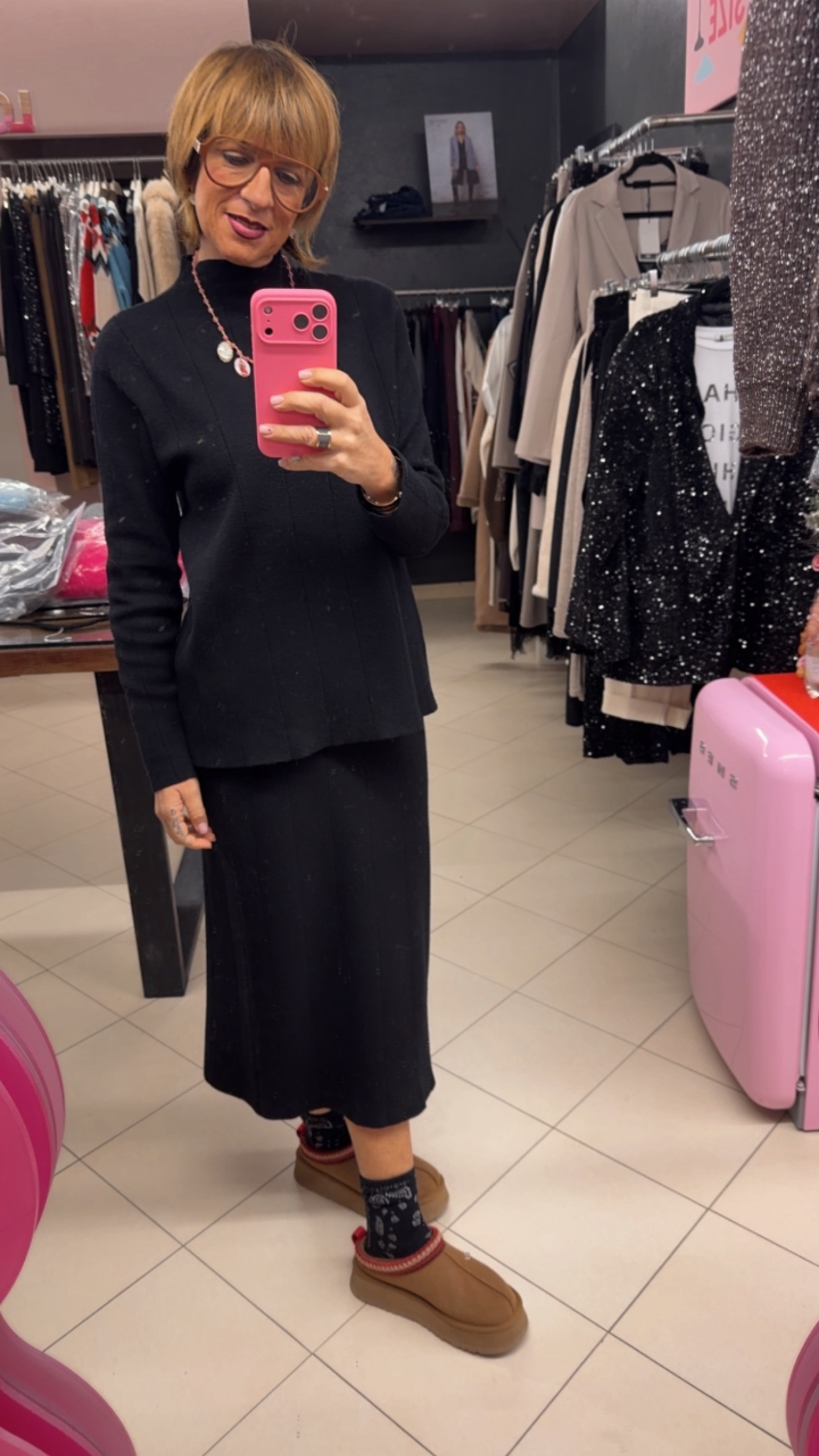 Completo in maglia, formato da longuette con elastico in vita e maglione con collo a cratere morbido e lungo che copre anche la zona dei fianchi