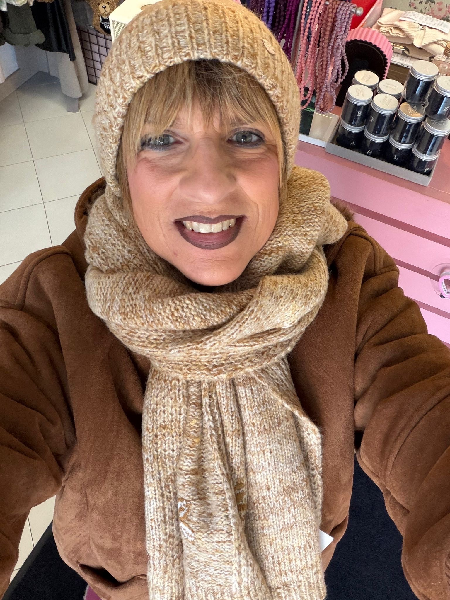 Cuffia e sciarpa ricami cammello
