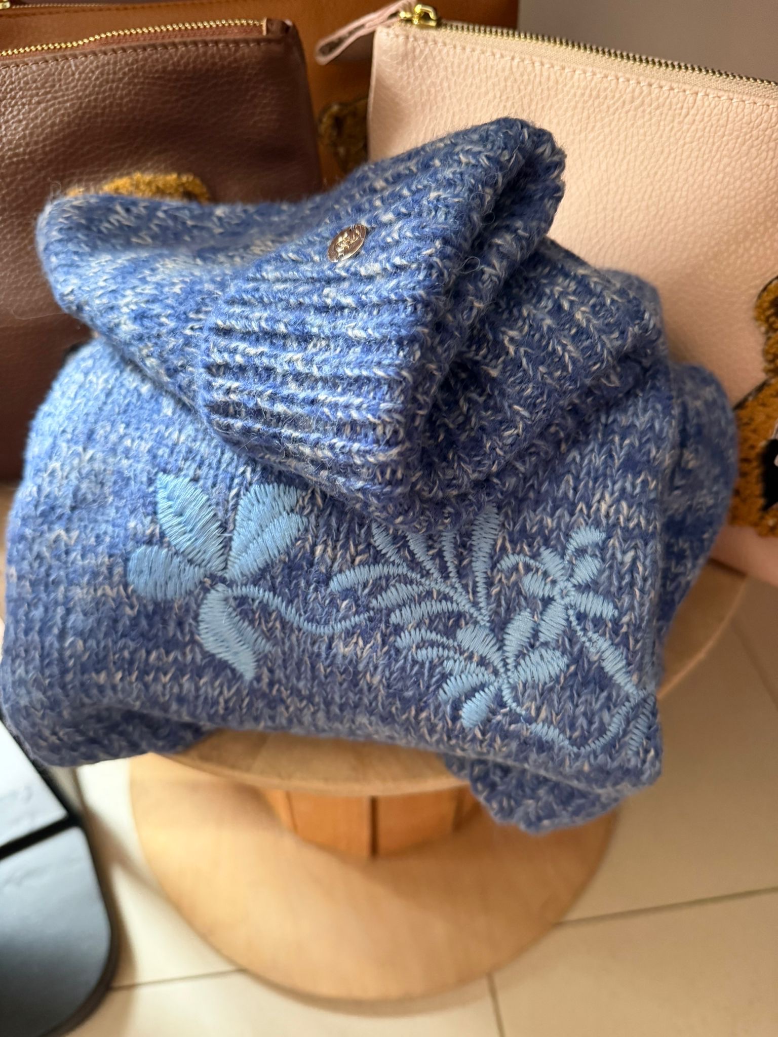 Cuffia e sciarpa ricami azzurra