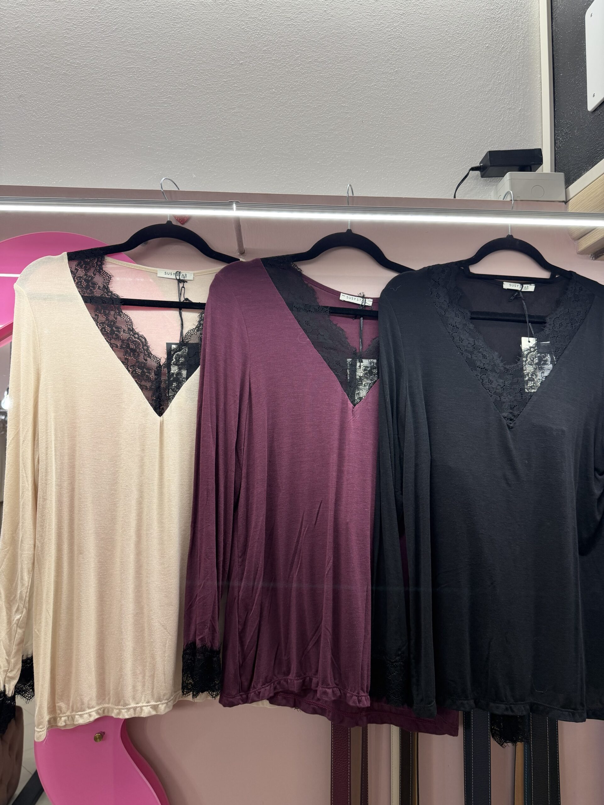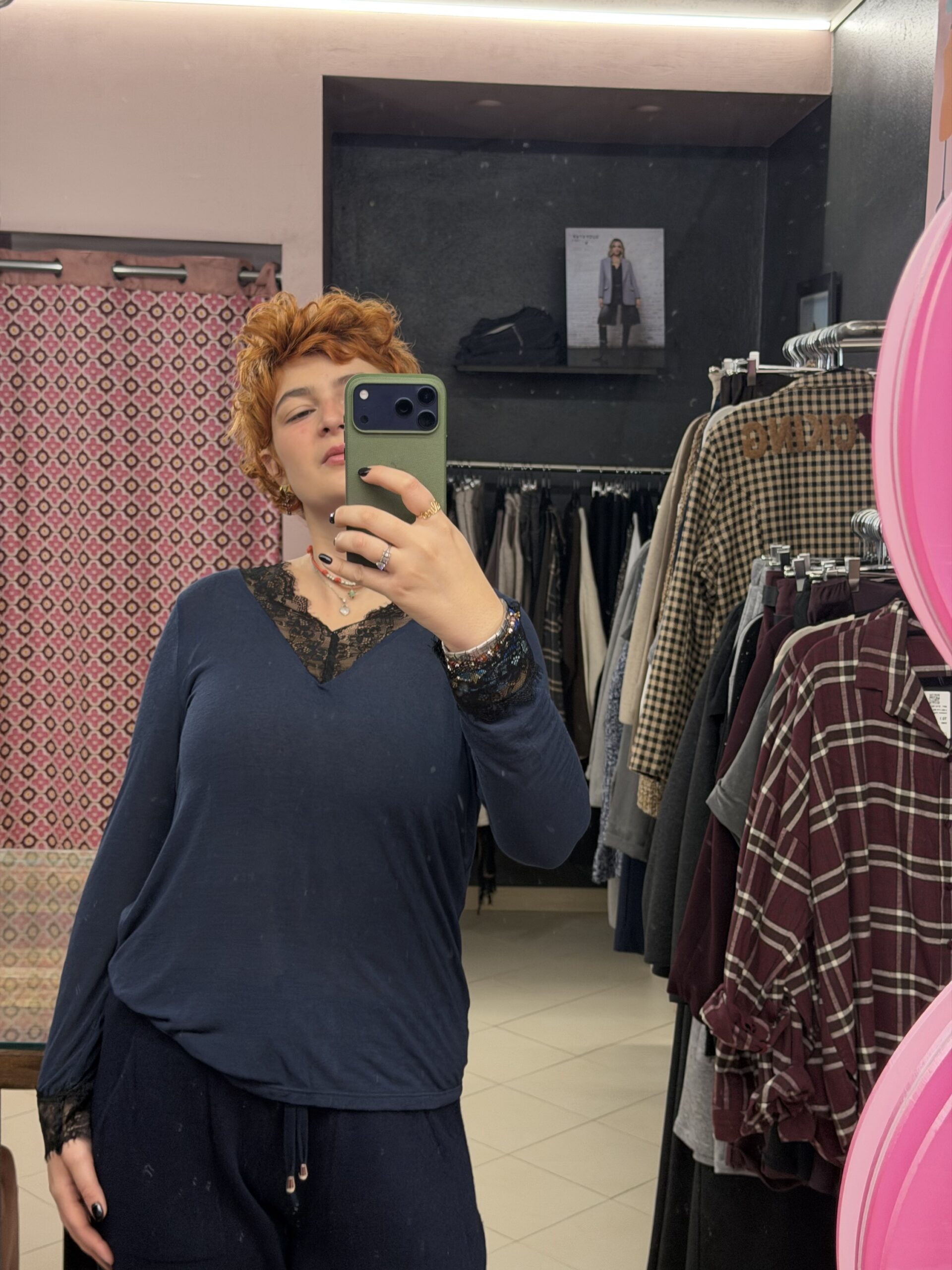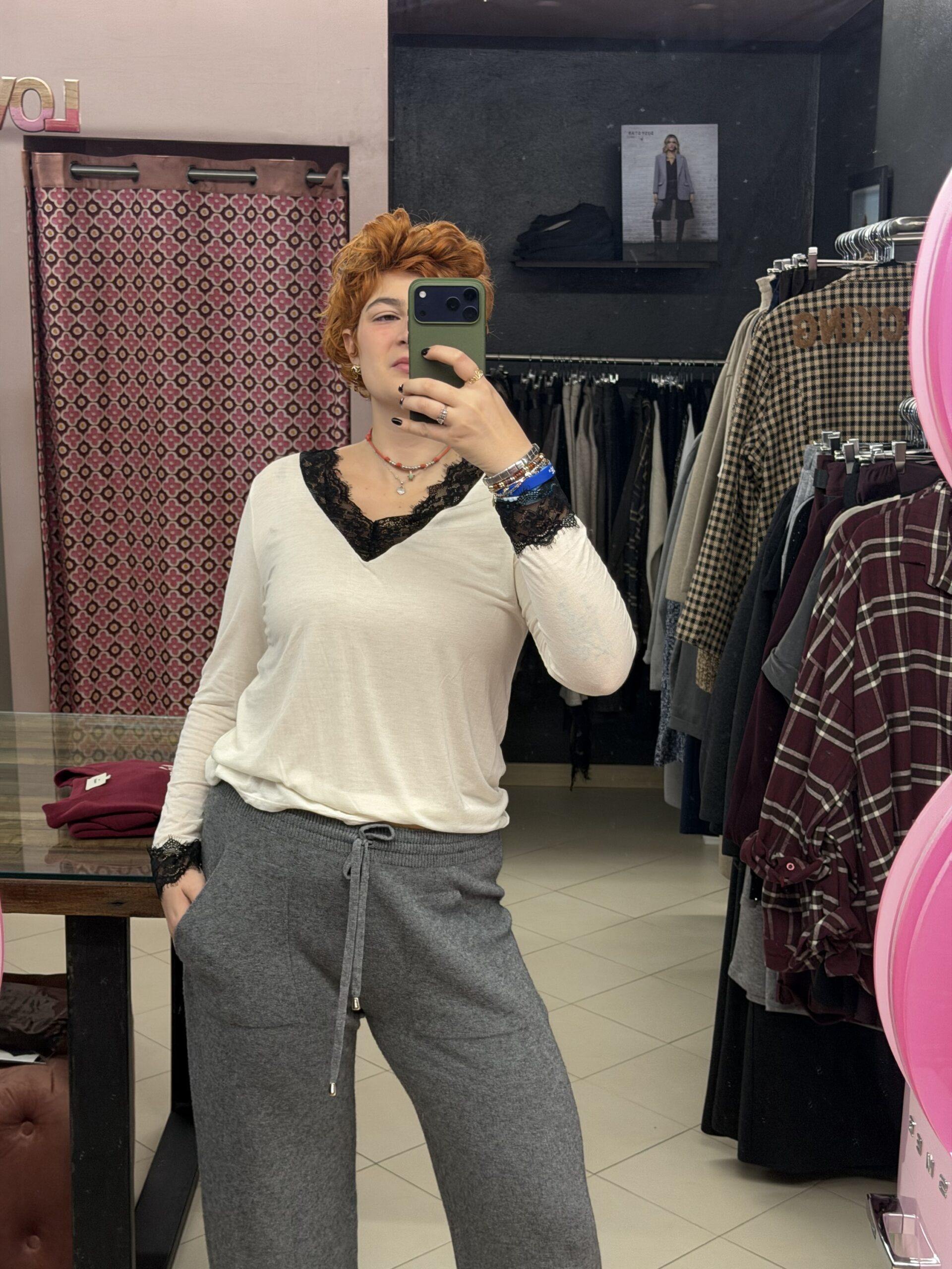 T shirt basica in misto cachemire con dettaglio del pizzo sia nello scollo a V che nel polso della manica