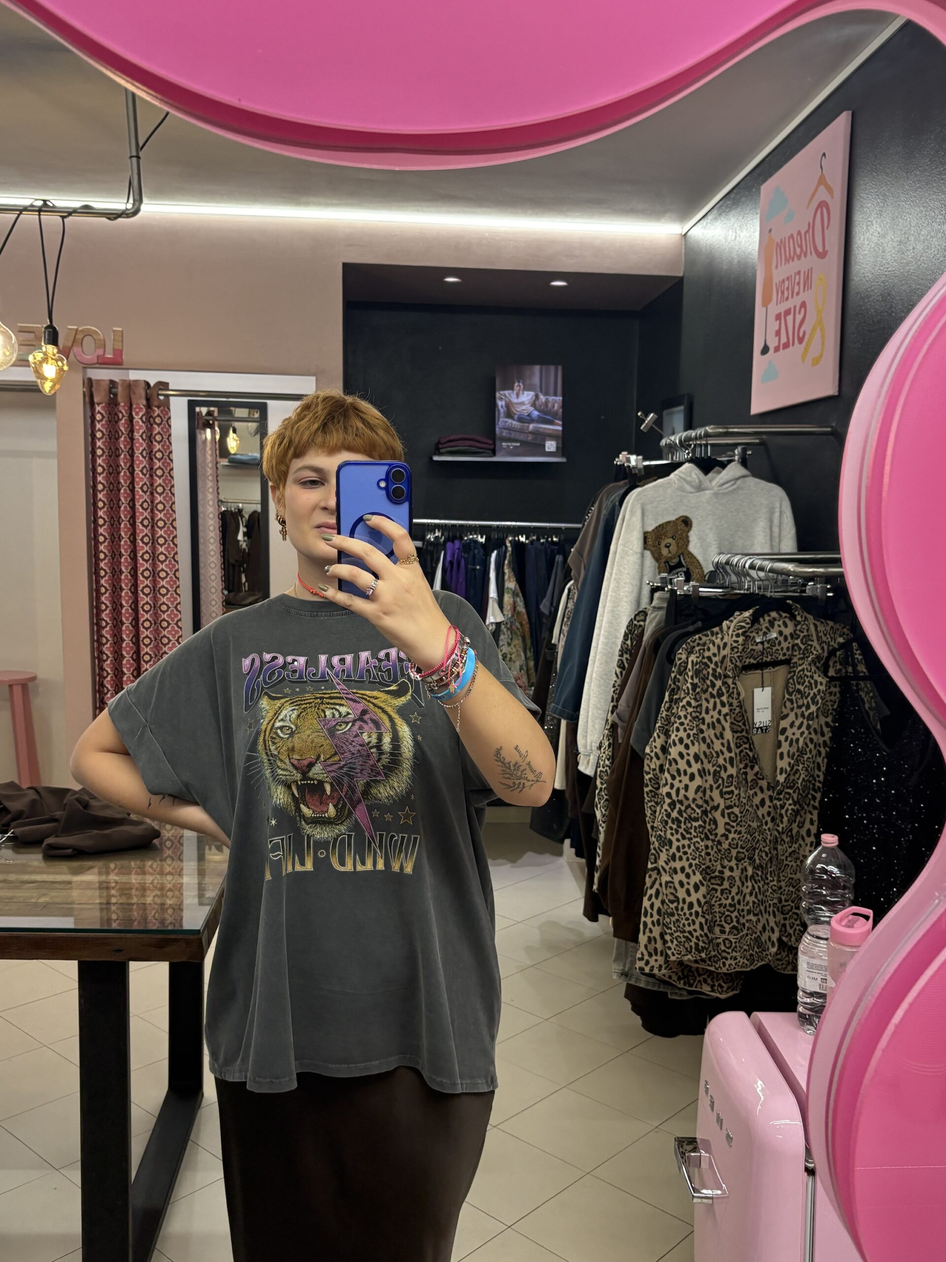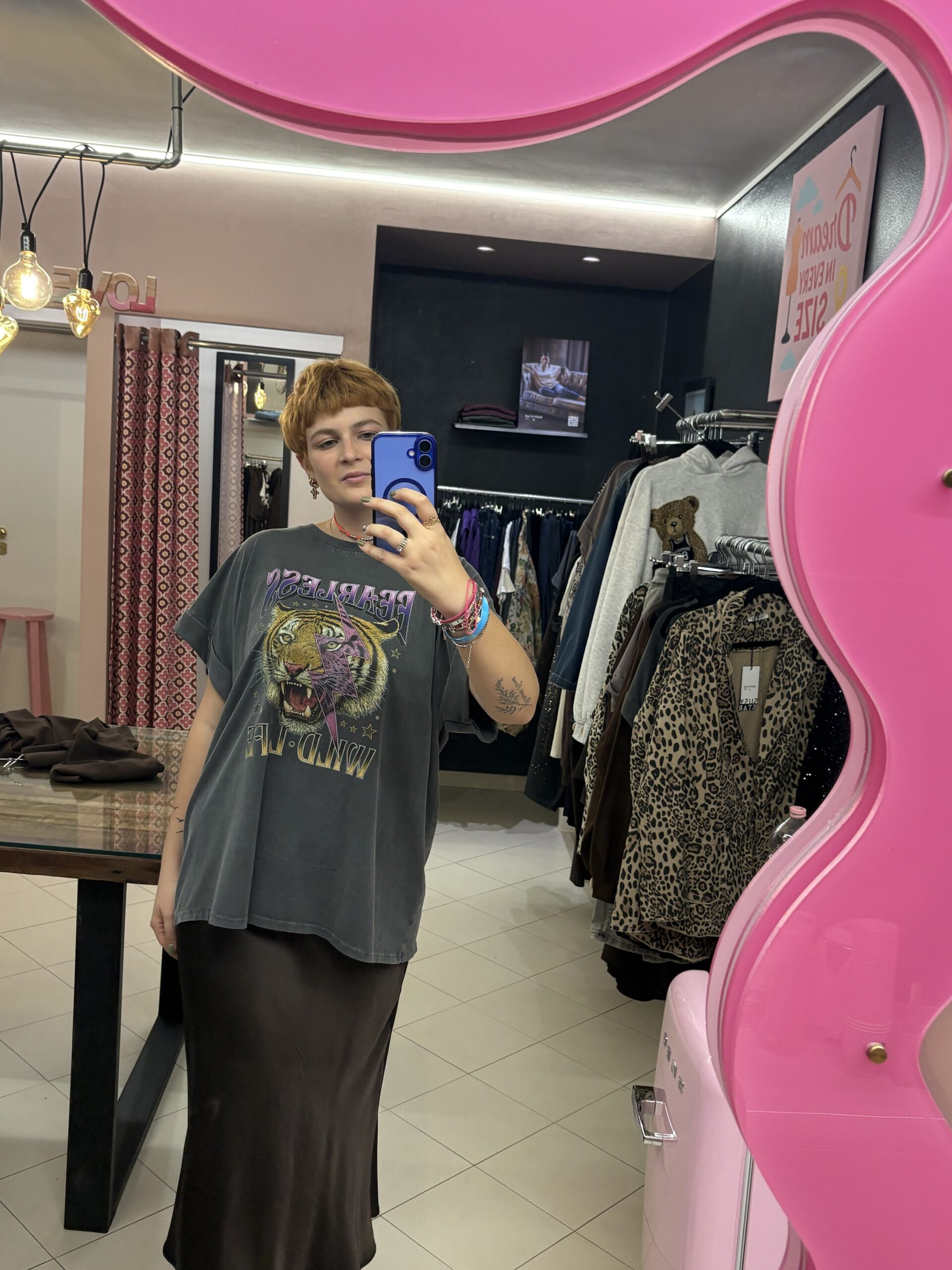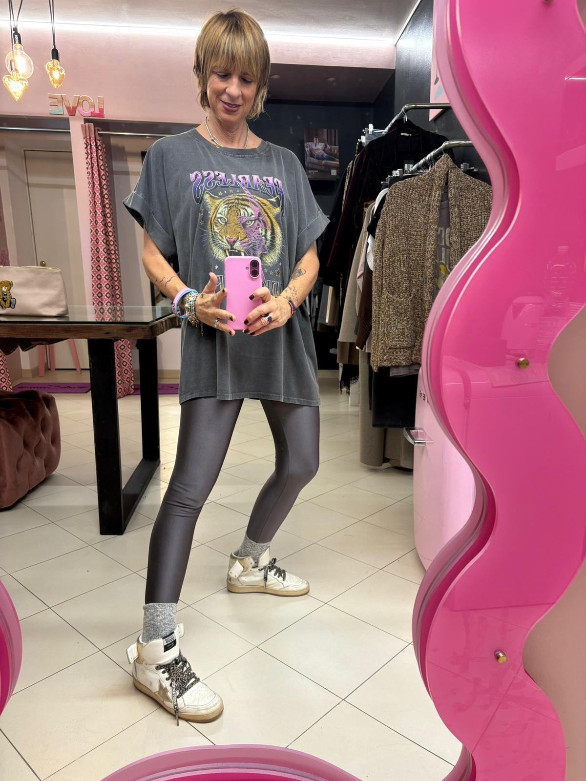 T-shirt in cotone con stampa centrale vestibilità curvi fino a una misura 54 piena, semplice ma ad effetto perfetta per i look che vanno adesso di tendenza comodissima e bellissima anche abbinata alle gonne di Satin come si vede in foto