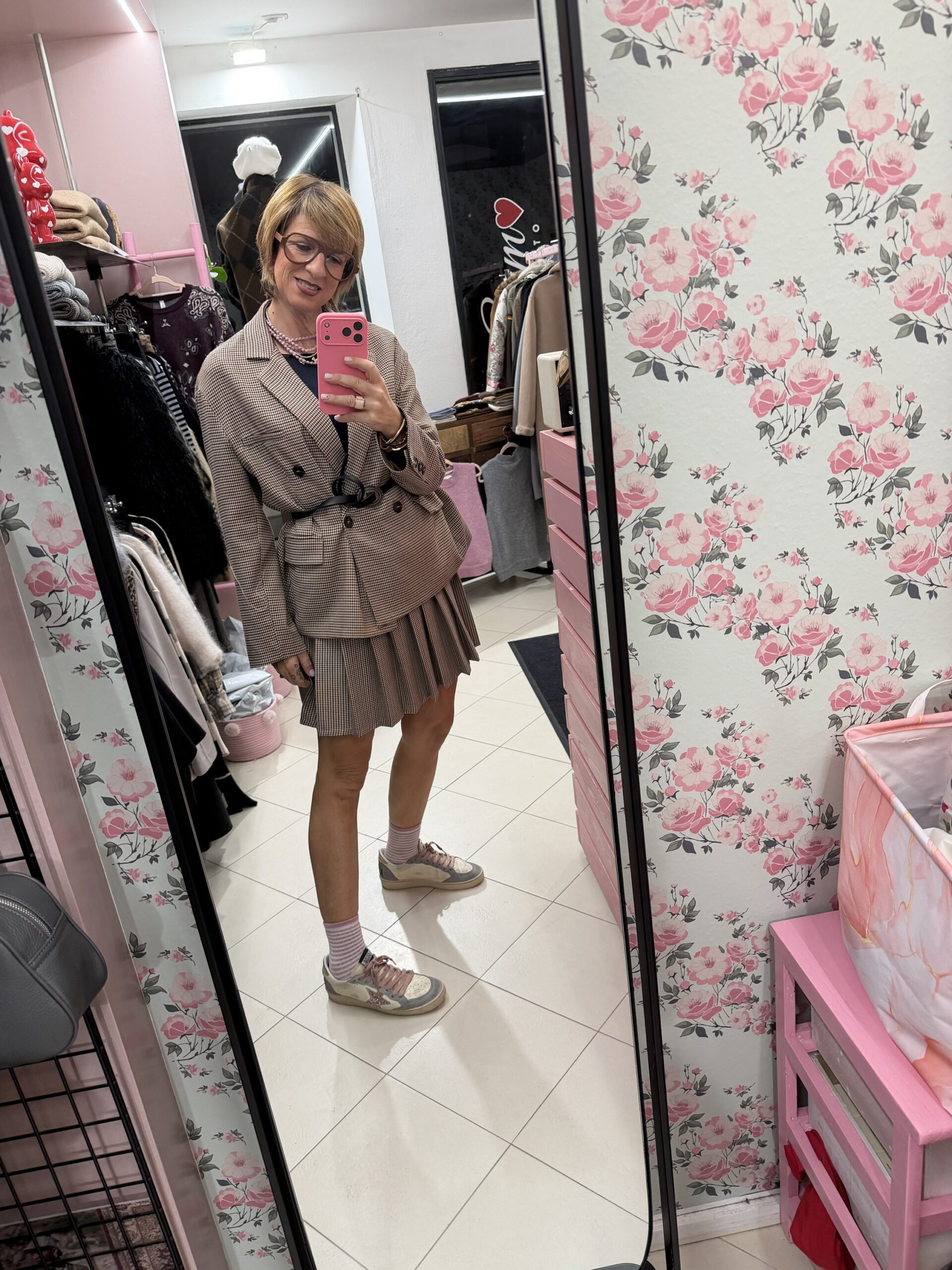 Tailleur formato da gonnellina a pieghe con blazer doppio petto morbido sopra